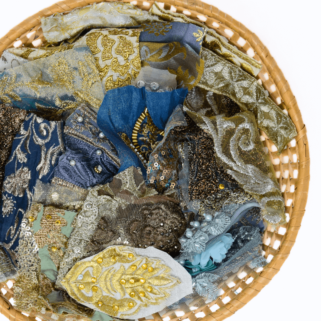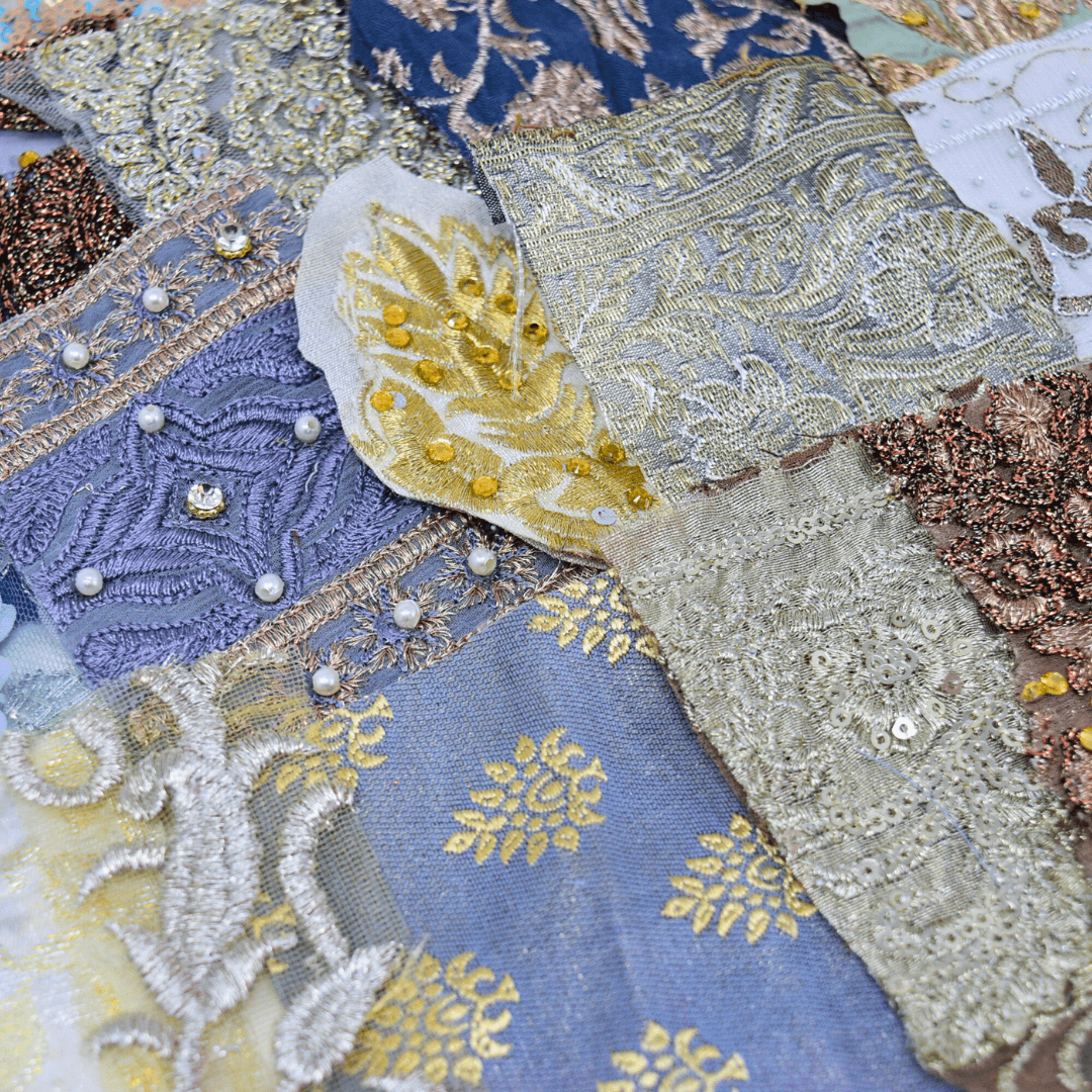 A Scandi-inspired colour palette with cool, neutral tones and metallic accents may not have that traditional Christmas aesthetic but it definitely evokes a cosy, festive vibe. With twinkling textures and intricate bohemian detail, these enchanting pieces of embellished sari cloth are perfect for decorating junk journal pages, creating pockets, or adding decorative tabs.