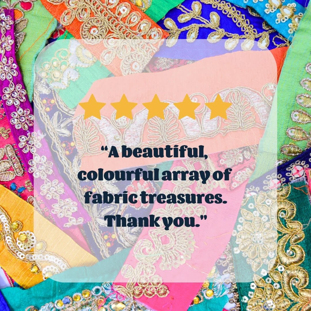A visual feast of vibrant hues, golden thread work, colourful embroidery and eye-catching sparkles, these boho borders will instantly transport you to the glamorous world of a Bollywood film set! Rescued by us for you, these beautiful saree trims now have their time to shine, ready to be transformed - turn them into textile jewellery, patchwork bags or even make some cute little fabric patches.